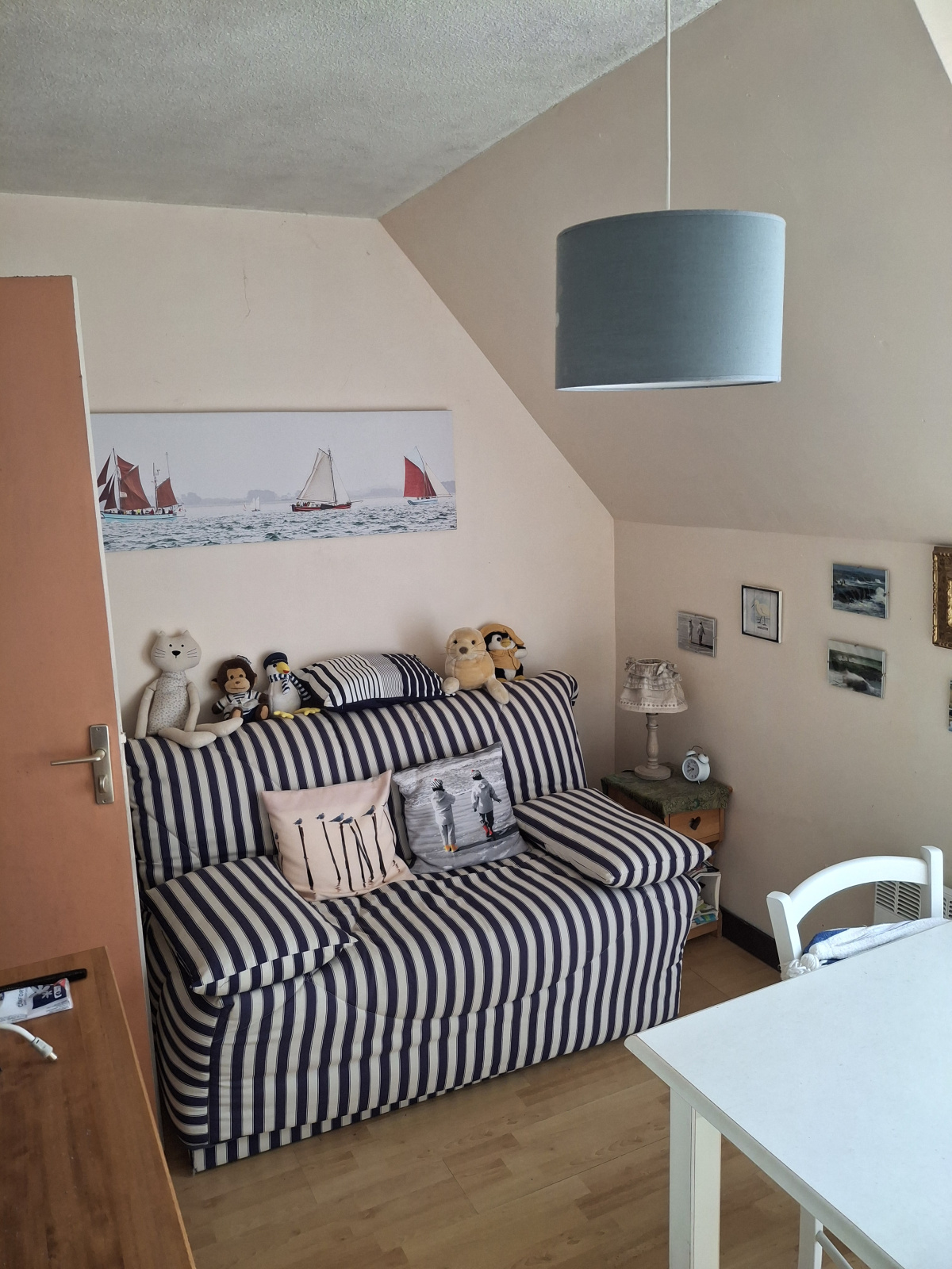 Studette de 14,10 m² au premier étage d'une résidence sécurisée par digicode, avec une pièce à vivre incluant une kitchenette, une salle d'eau avec WC et une pièce annexe à usage de buanderie.